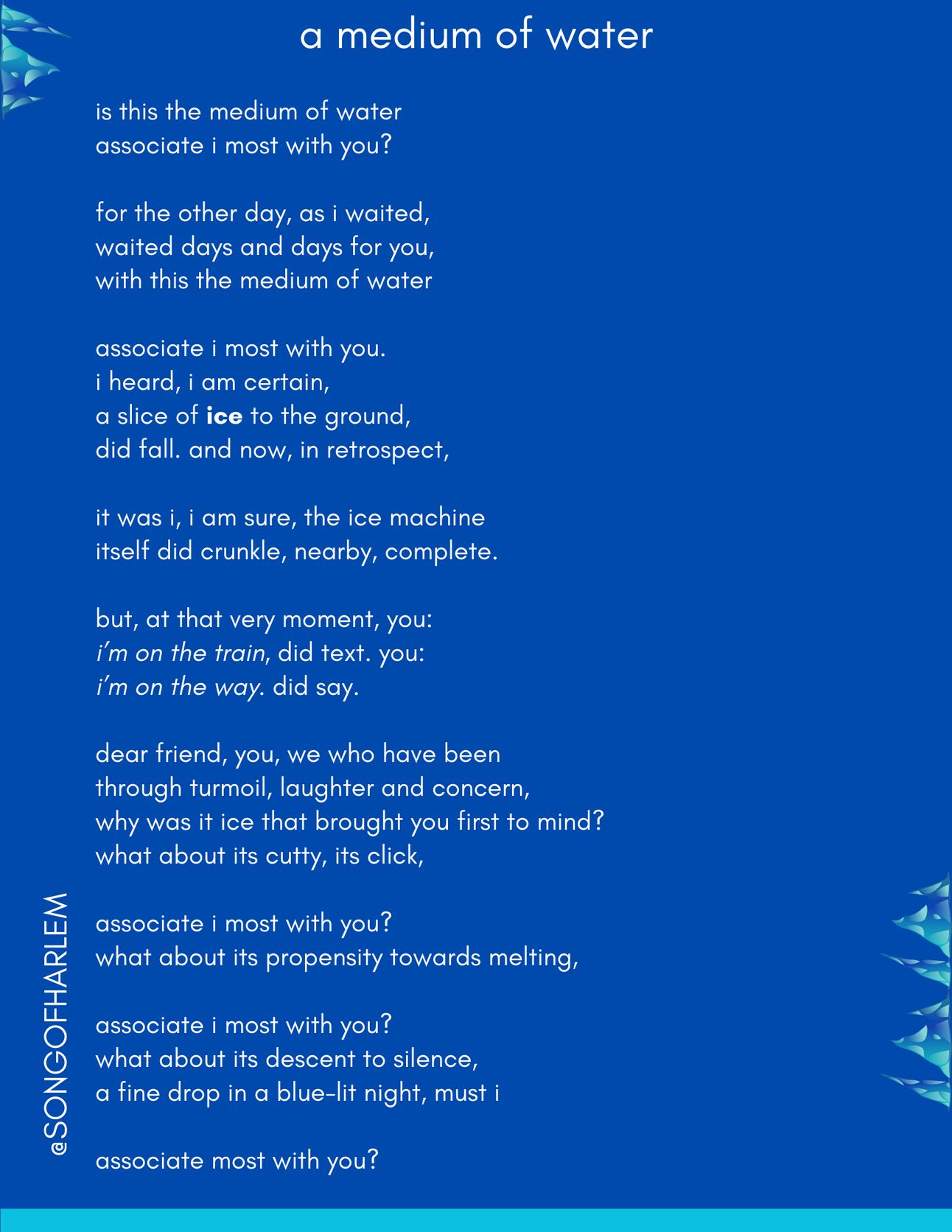 Text within this block will maintain its original spacing when publisheda medium of wateris this the medium of water associate i most with you? for the other day, as i waited, waited days and days for you, with this the medium of water associate i most with you. i heard, i am certain, a slice of ice to the ground, did fall. and now, in retrospect, it was i, i am sure, the ice machine itself did crunkle, nearby, complete. but, at that very moment, you: i’m on the train, did text. you:i’m on the way. did say. dear friend, you, we who have beenthrough turmoil, laughter and concern, why was it ice that brought you first to mind? what about its cutty, its click, associate i most with you? what about its propensity towards melting, associate i most with you?what about its descent to silence, a fine drop in a blue-lit night, must iassociate most with you?